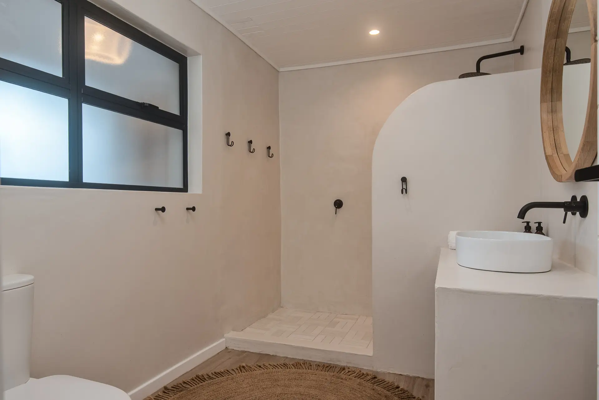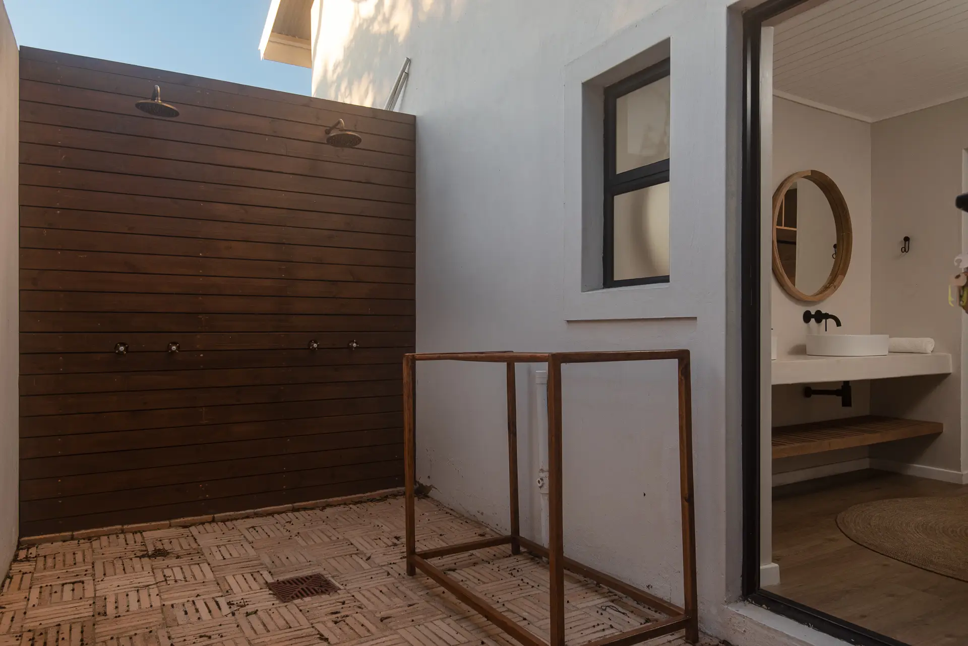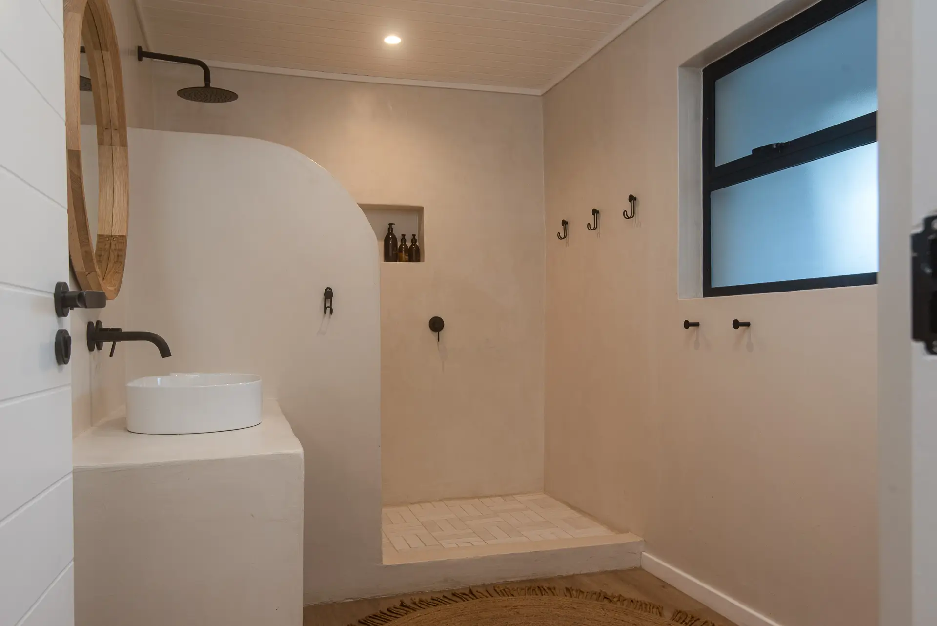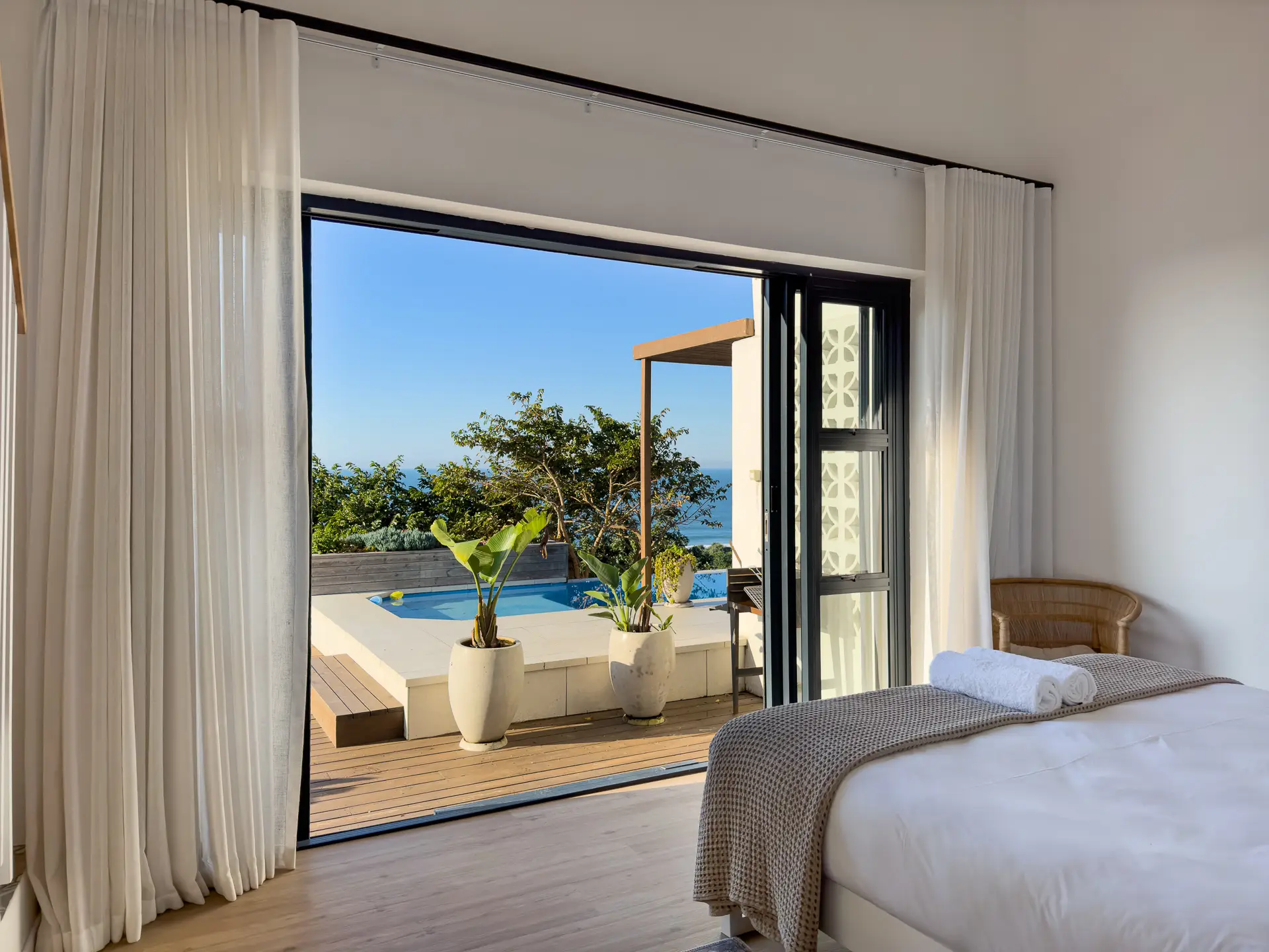 The main bedroom also features outdoor showers for a unique coastal experience.