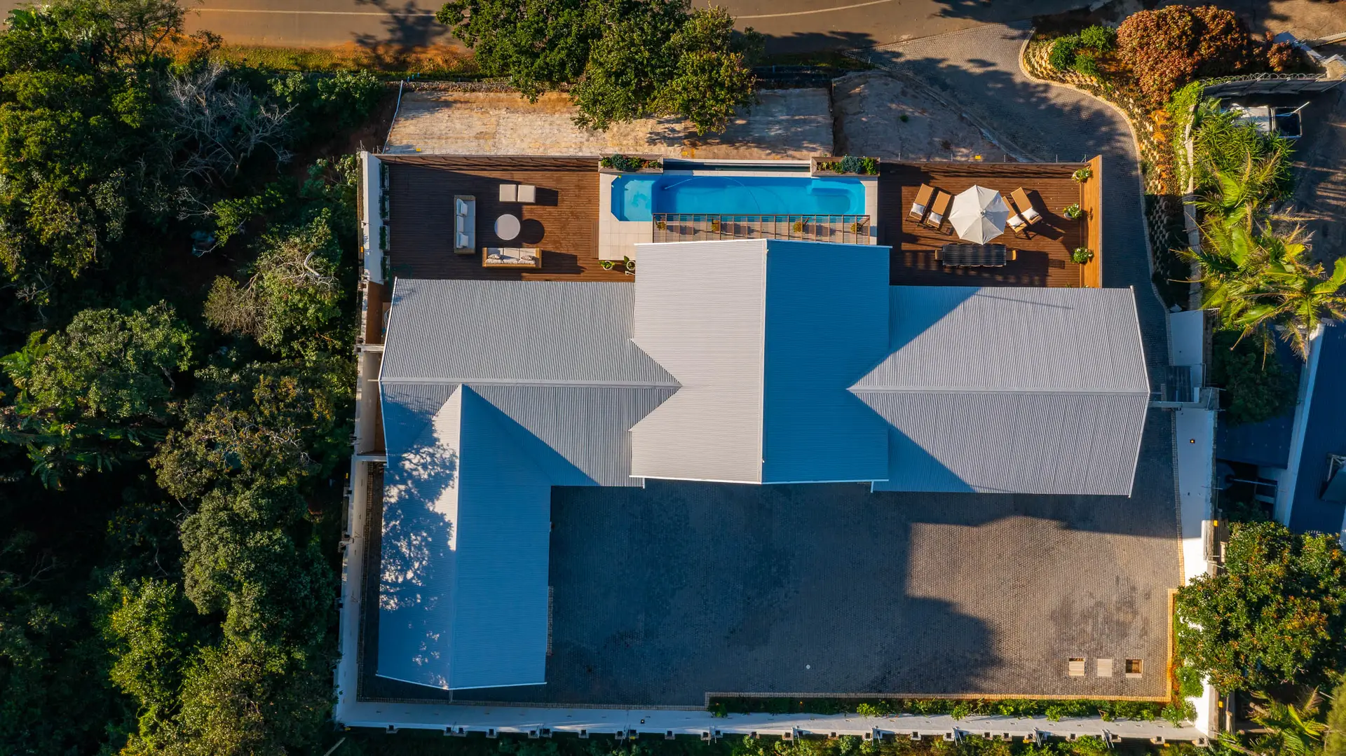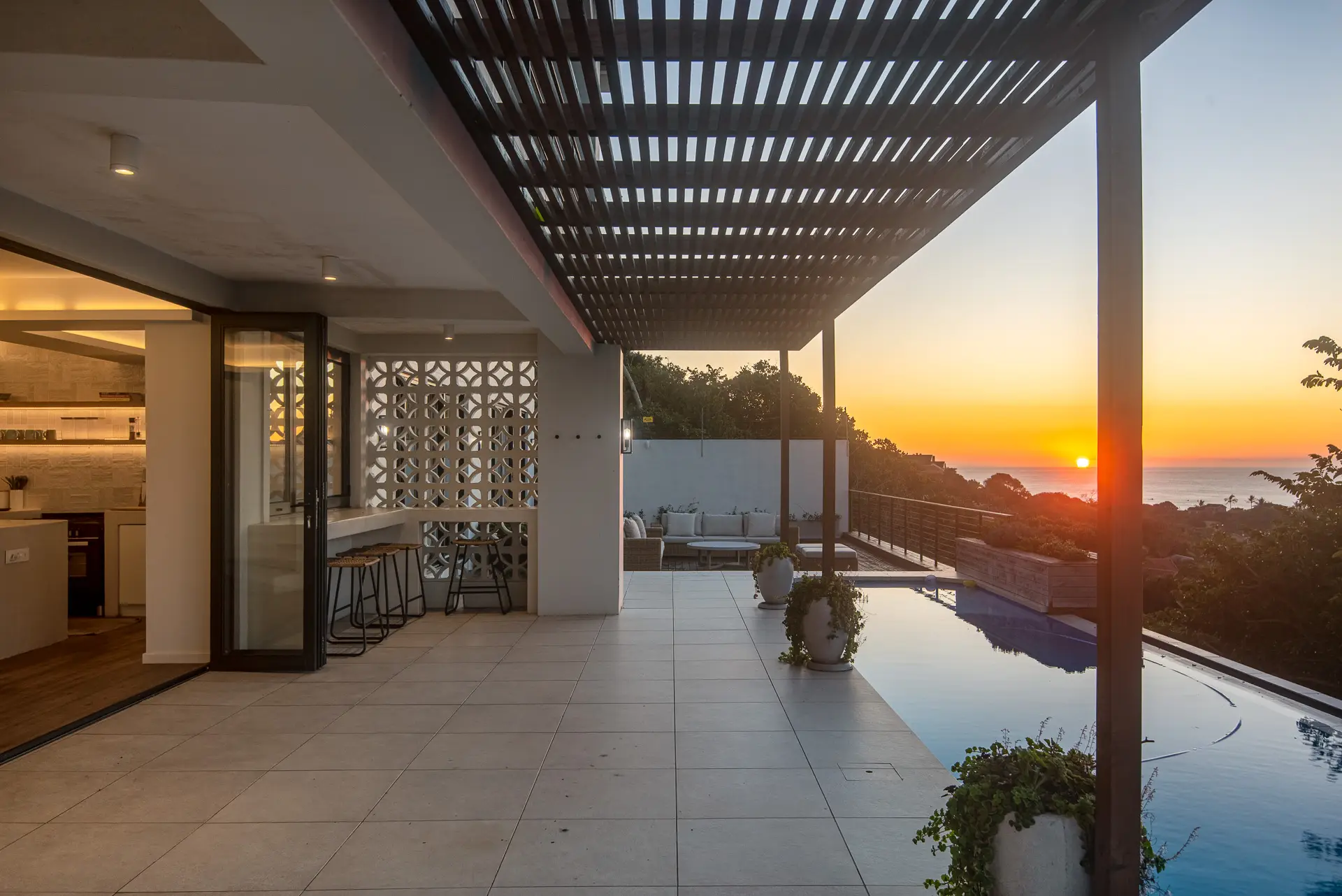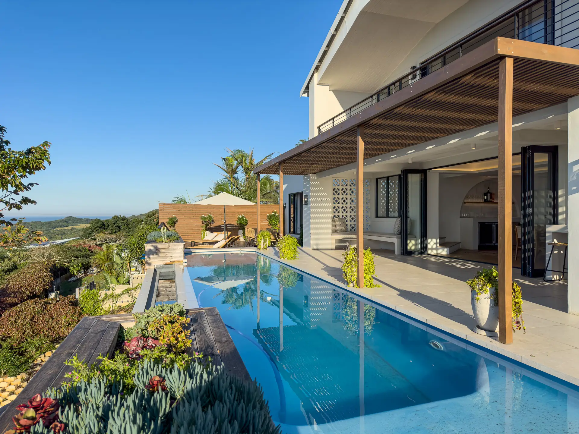 Designed for effortless indoor-outdoor living, the property features a large rim-flow pool (netted) surrounded by an expansive deck. Here, guests can enjoy comfortable lounge areas, an alfresco dining space, braai facilities, and sun loungers—perfect for soaking up the coastal sunshine.