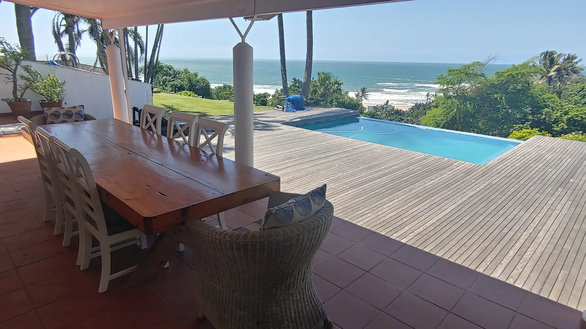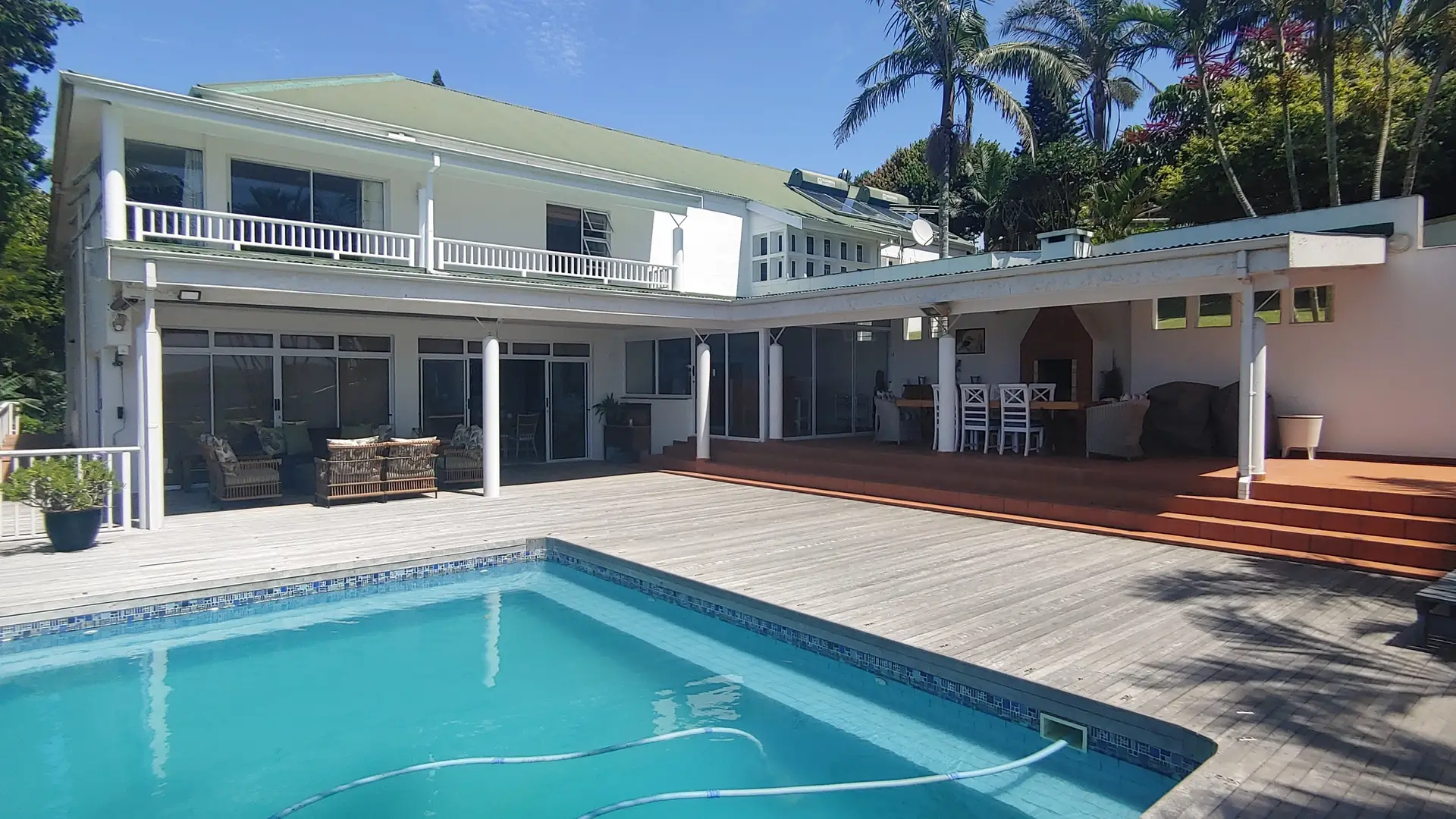 The stunning pool area overlooks the ocean and is fitted with a safety net. A spacious deck invites sun lovers to relax, while evenings can be enjoyed around your choice of braai facilities or the fire pit with seating. The large L-shaped covered veranda is perfect for al fresco dining or unwinding in the shade, and a generous lawn provides plenty of space for children to play. The home also offers wheelchair-friendly access to the lower level, including an en-suite bedroom with a suitable bathroom.