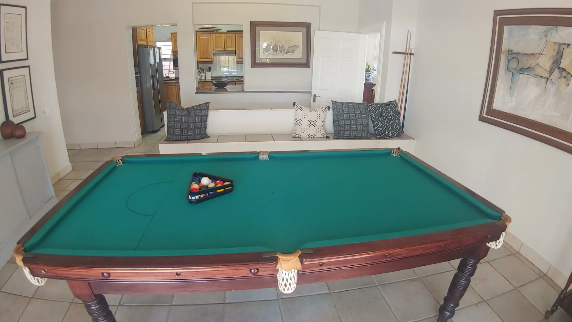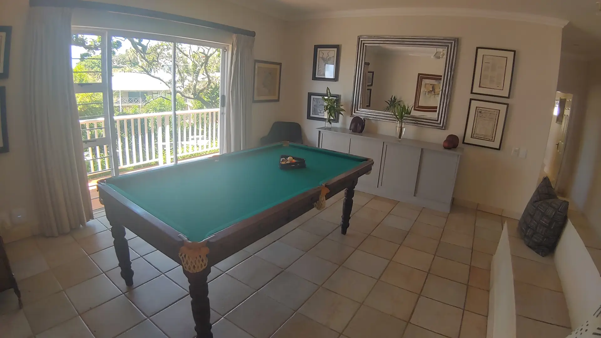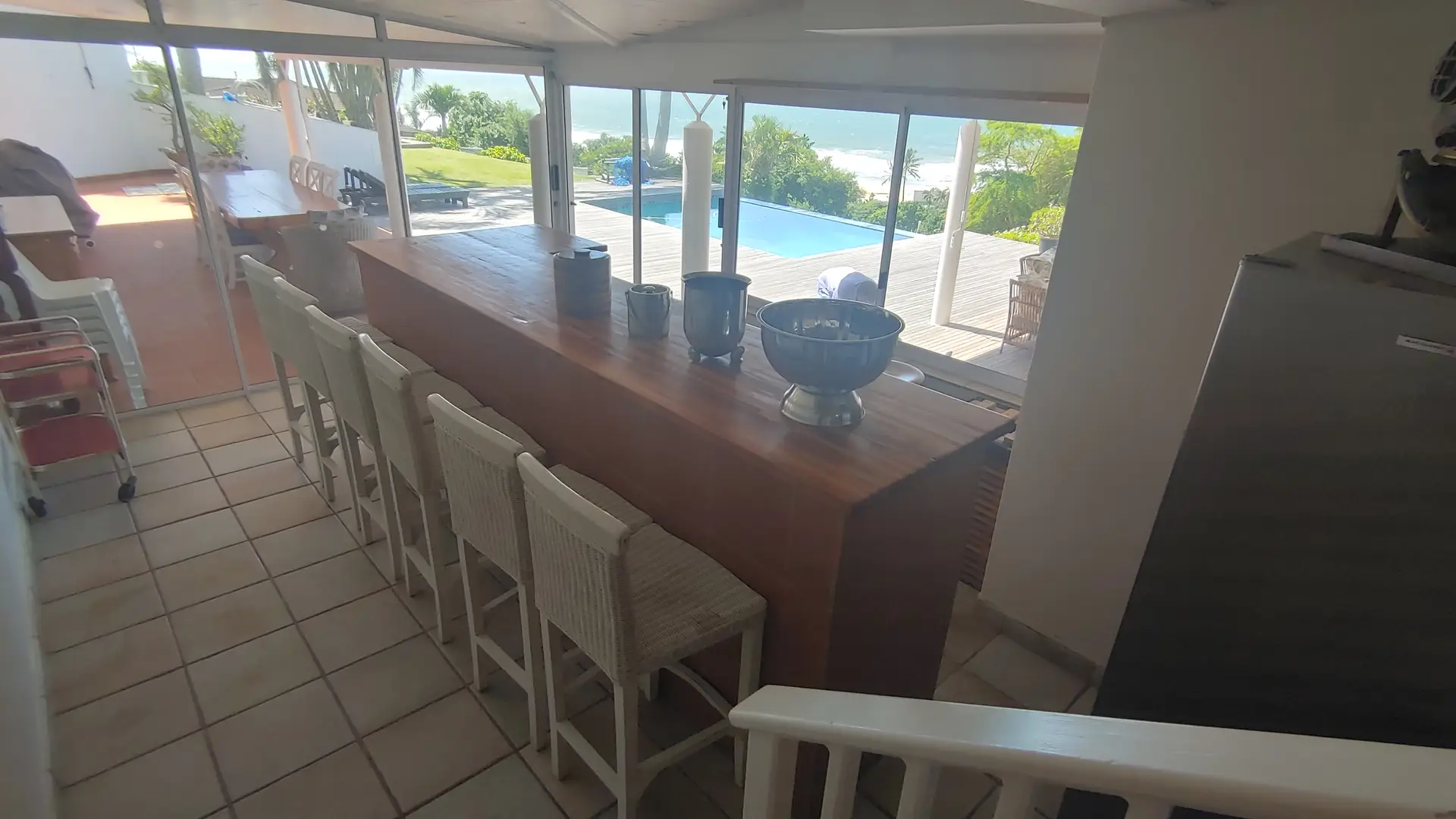 The lower level includes a lounge, dining room, pool room, kitchen, scullery, bar, and guest toilet. A spacious covered veranda with outdoor furniture leads to the netted pool and large deck. There is one wheelchair-friendly en-suite bedroom with a double bed.