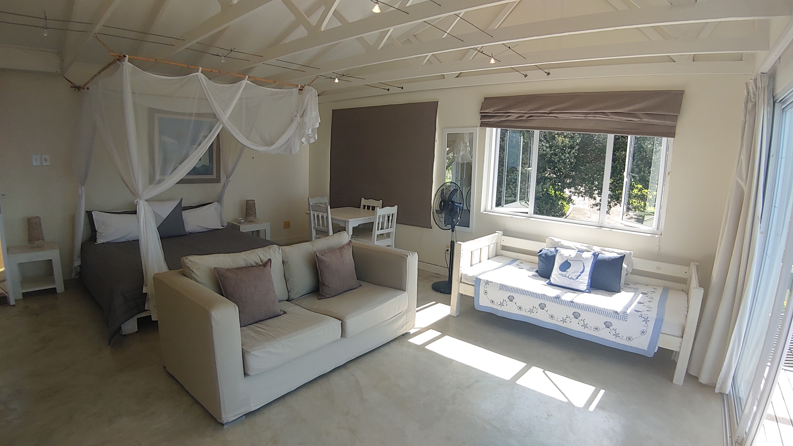 The Flat: Open plan bedroom, kitchenette, full bathroom, lounge and deck with amazing views.