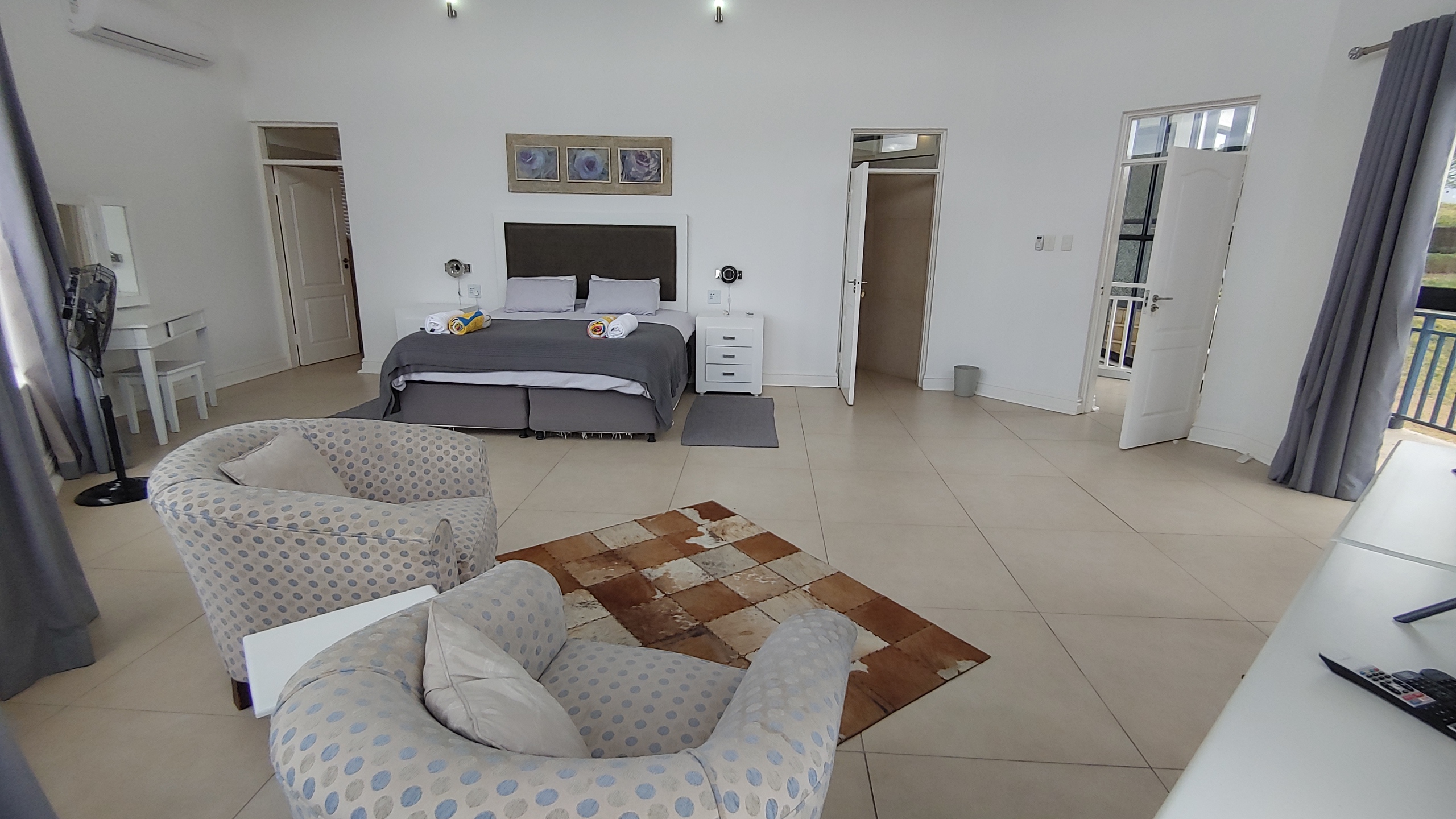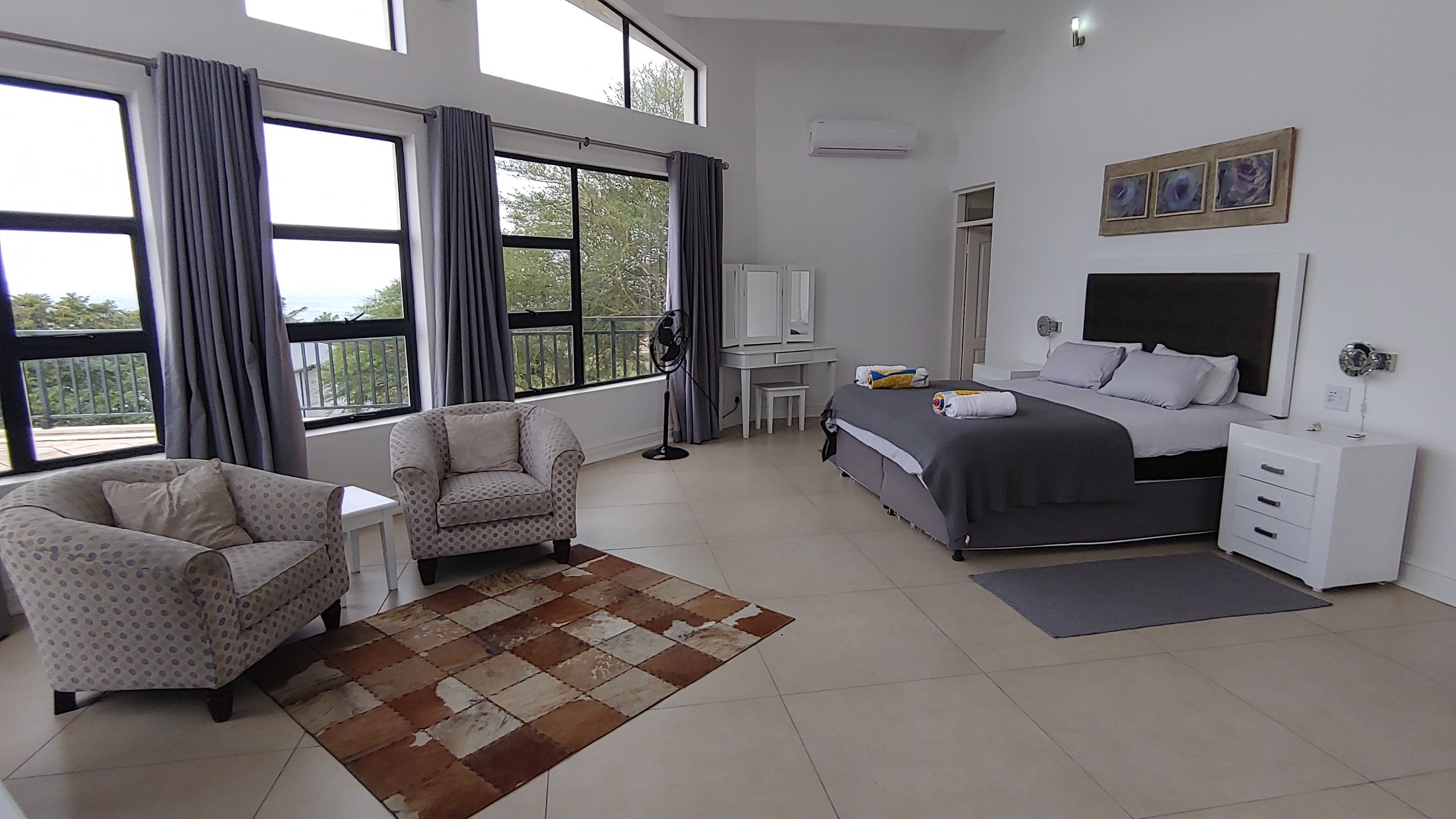 The expansive master suite is also located upstairs and features a full en-suite bathroom, air conditioning, and a large private veranda with sea views.