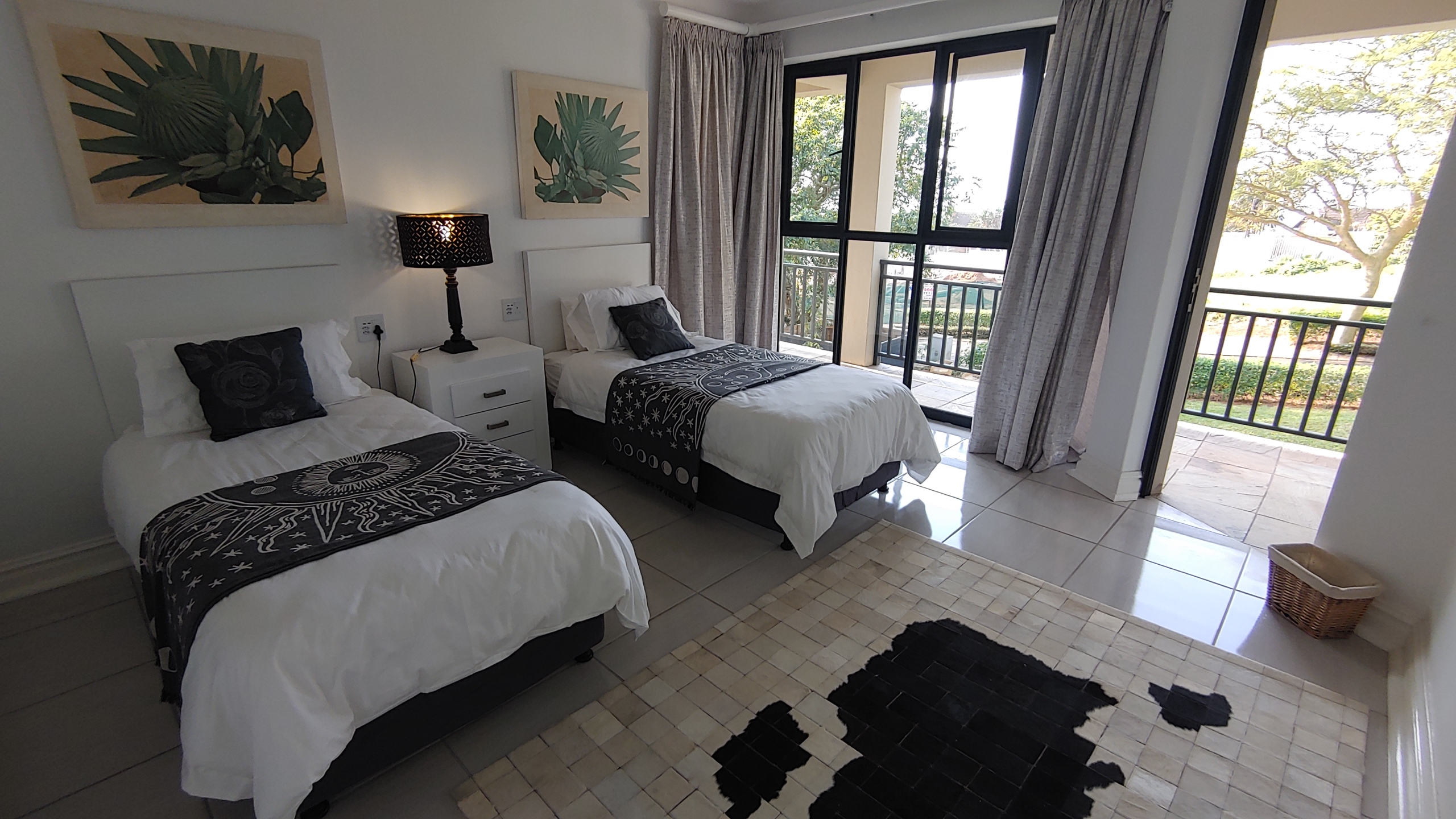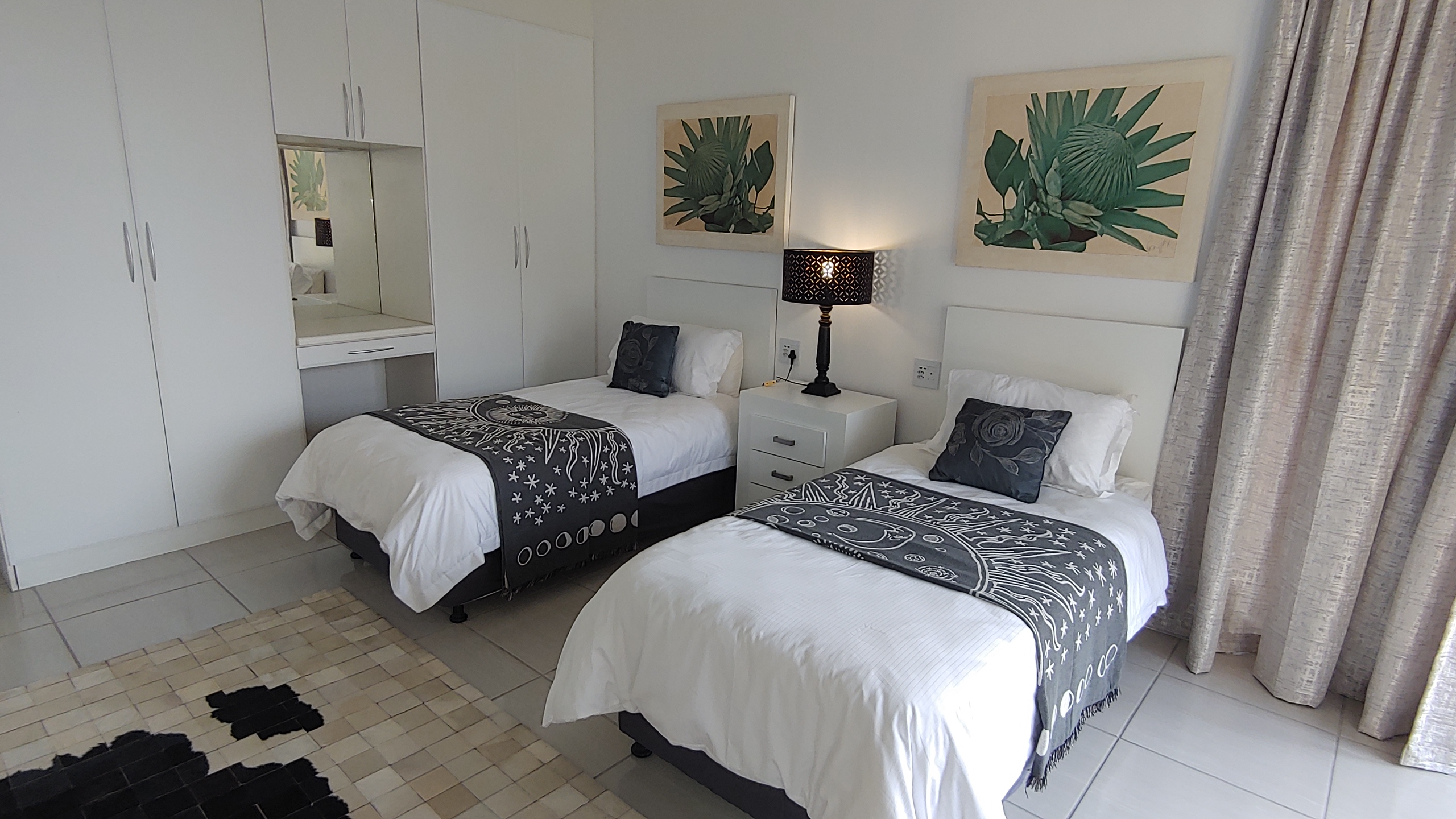 Bedroom 1: Two single beds with access to full bathroom.