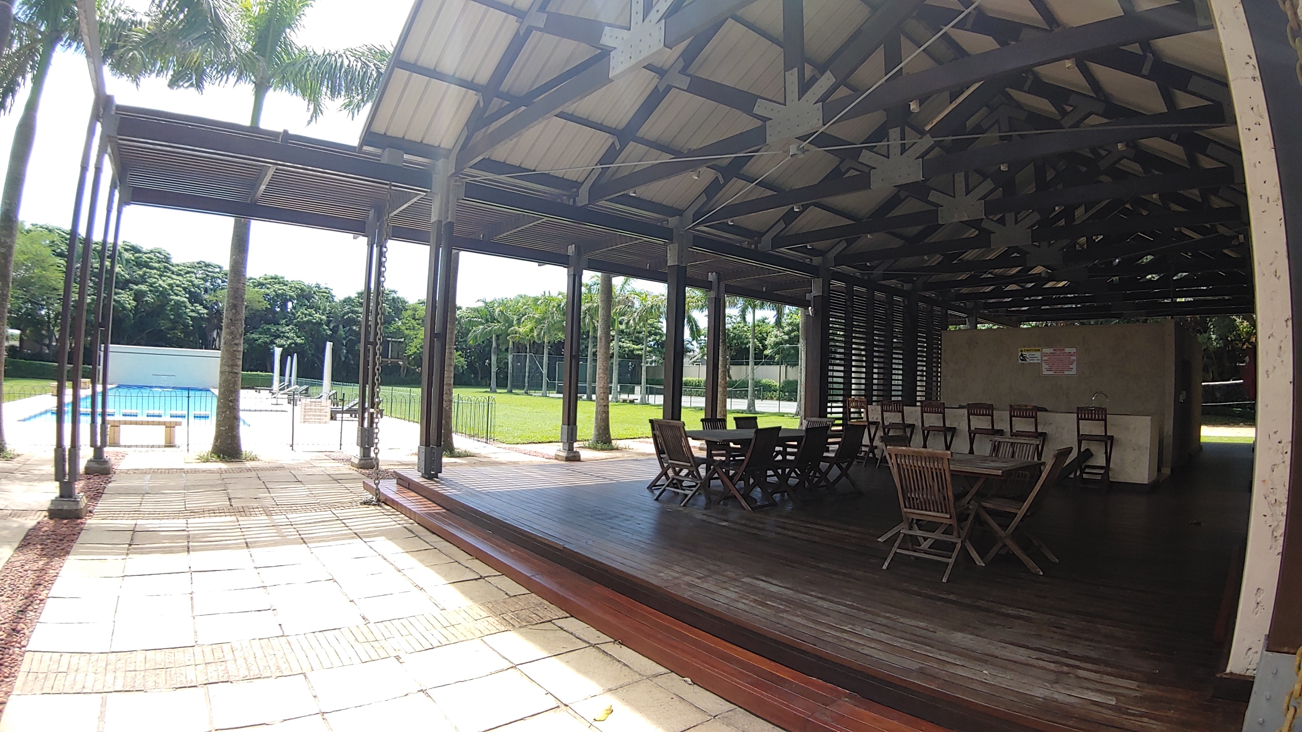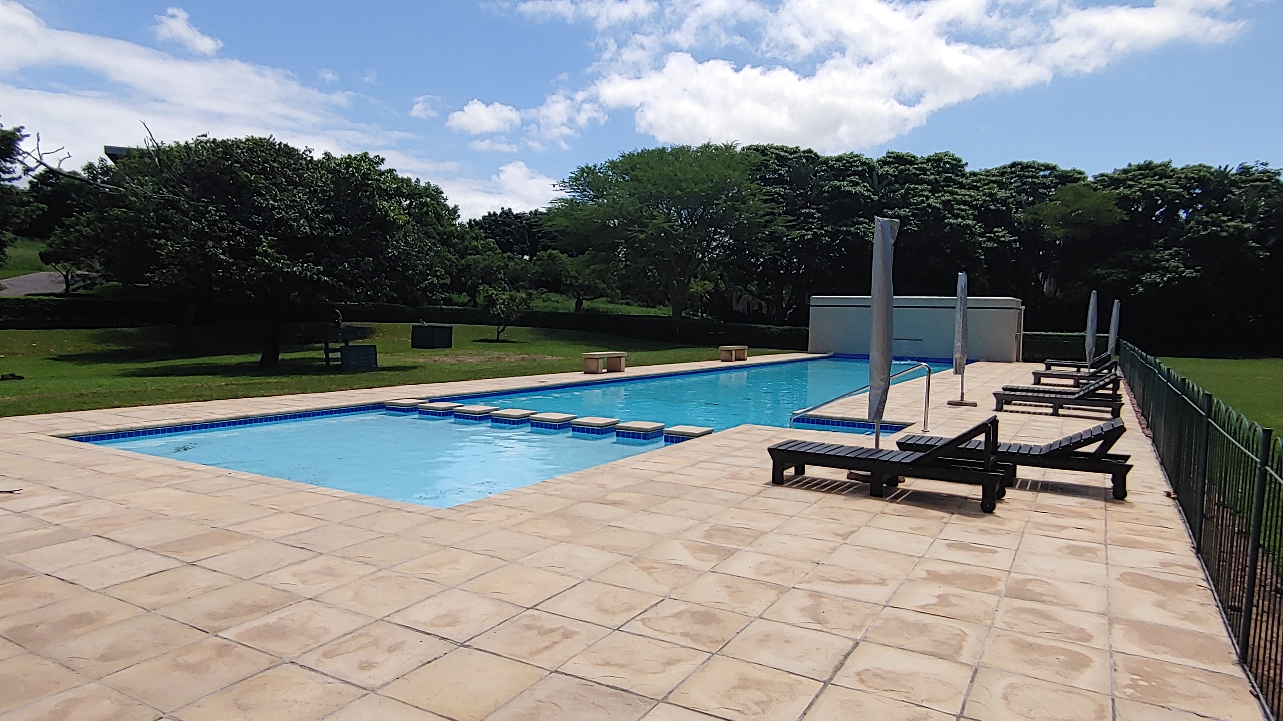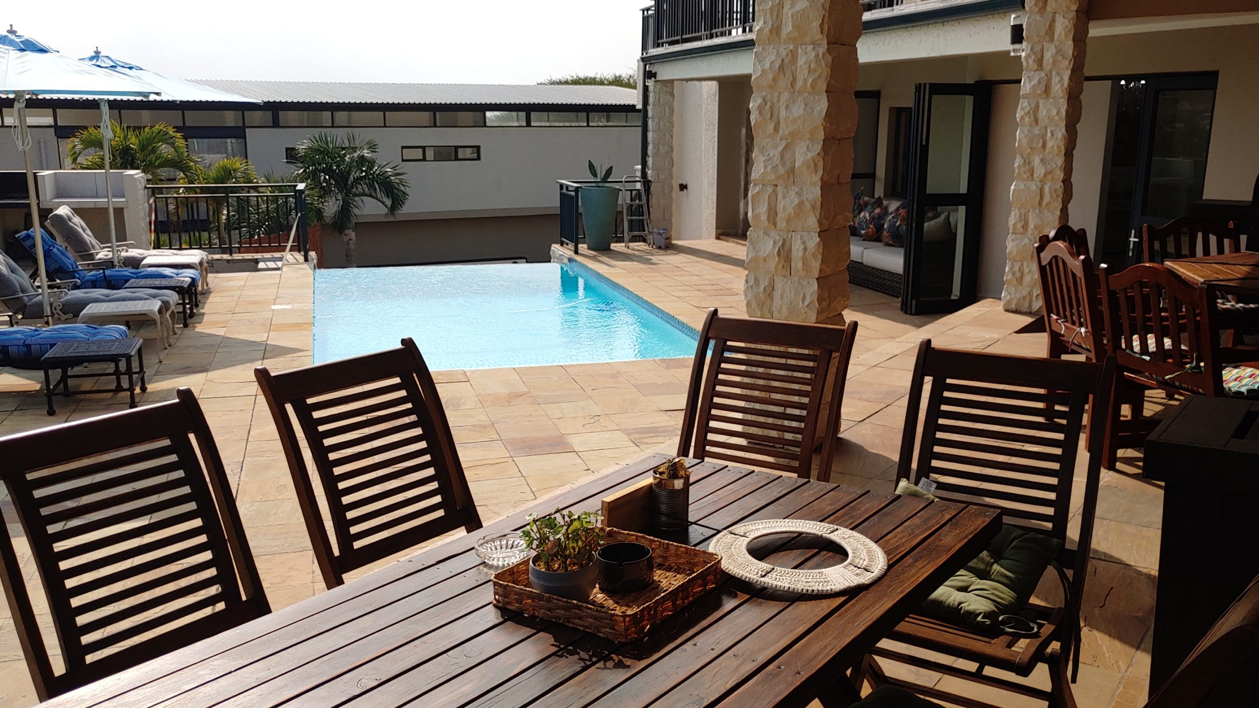 The outdoor space is perfect for entertaining, with a large gas braai, sun loungers, and umbrellas surrounding the sparkling pool.